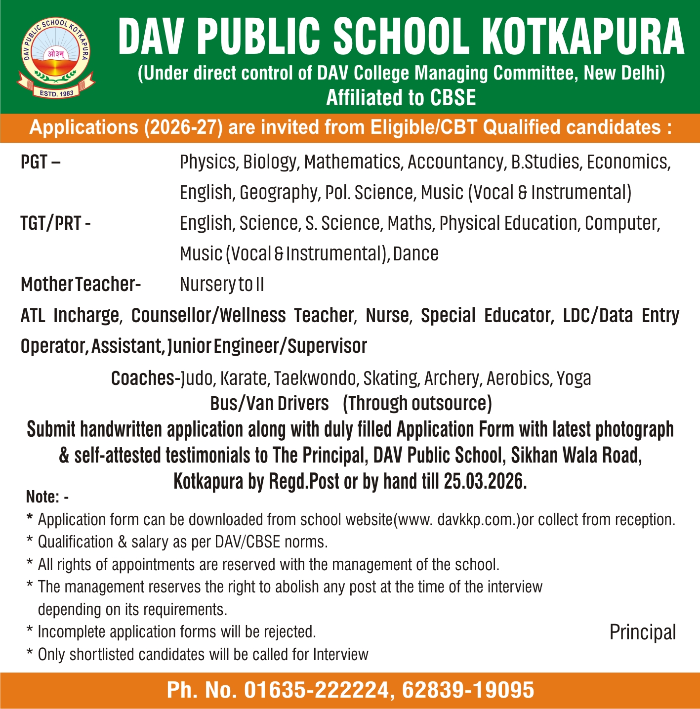 DAV Public Senior Secondary School, Kotkapura, a sapling planted in the year 1983, has now grown up into a well-nourished plant. The school is CBSE affiliated (Affiliation No. 1630101) and under the direct control of DAV College Managing Committee, New Delhi. It has gracefully completed its 38 years.